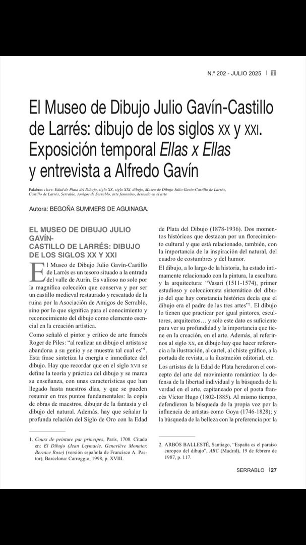 <<El Museo de Dibujo Julio Gavín-Castillo de Larrés: dibujo de los siglos XX y XXI. Exposicion temporal Ellas x Ellas y entrevista a Alfredo Gavín>>, Serrablo (Sabiñánigo), Núm. 202, pp. 27-33.